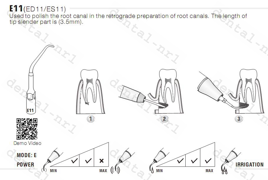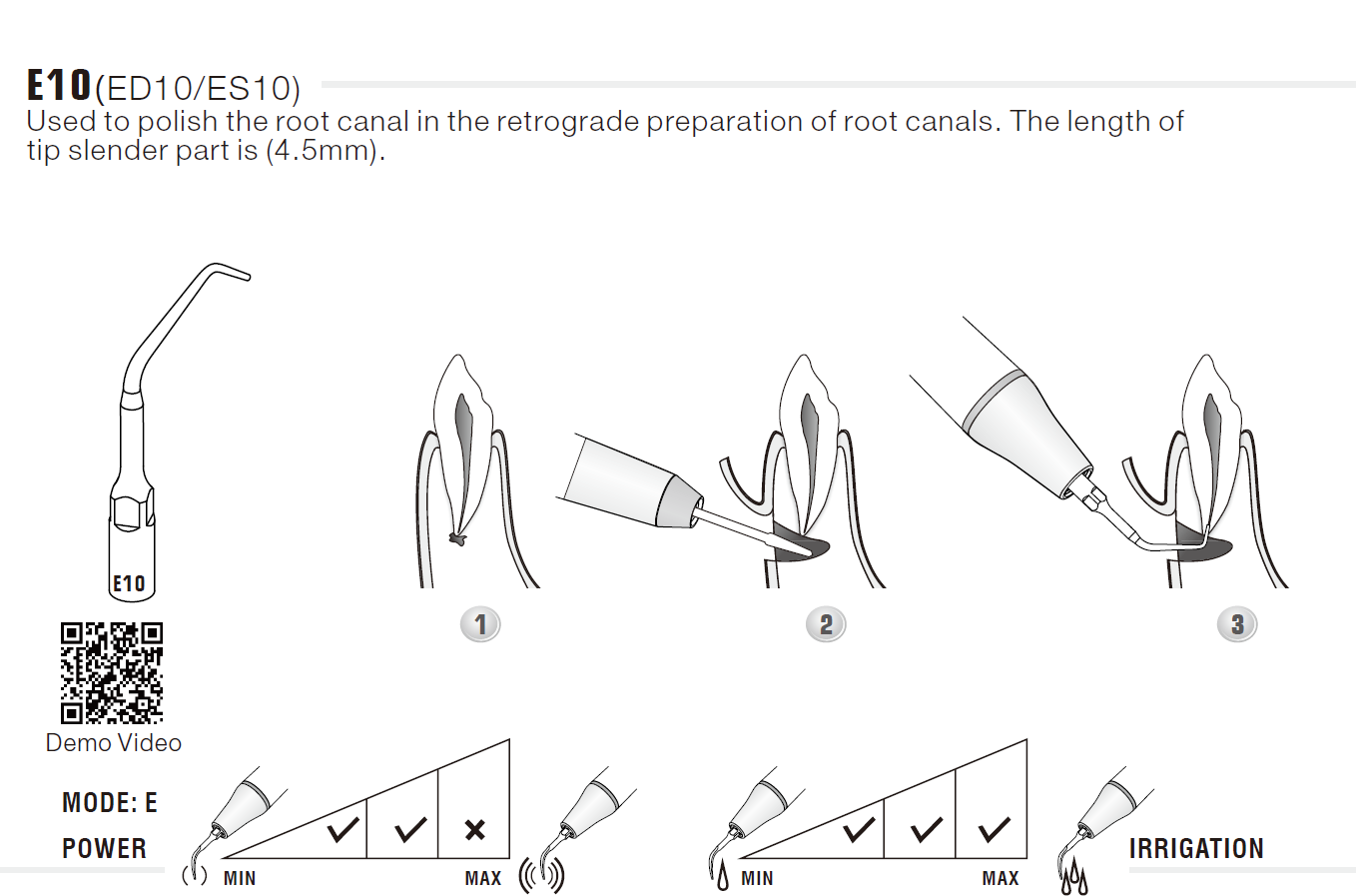 E3 (ED3 / ES3): Empfohlen zum Schmelzen von Guttapercha. Tauchen Sie das Instrument in Eugenol ein, bevor Sie es in den Kanal einführen. Drücken Sie das Instrument leicht gegen den Guttaperchakegel und aktivieren Sie den Scaler auf kondensieren, bis der Kanal gefüllt ist.