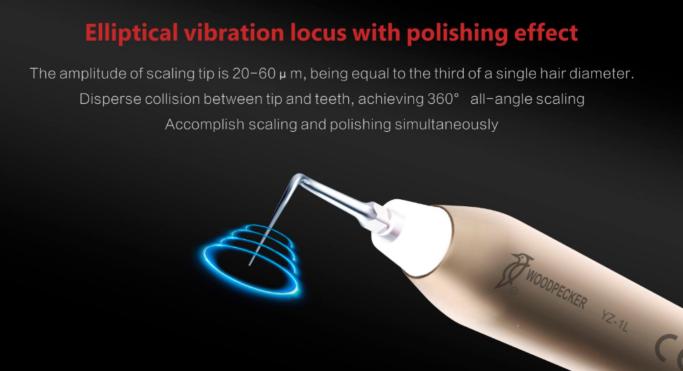 Elliptical vibration locus with polishing effectThe amplitude of scaling tip is 20-60μm, being equal to the third of a single hair diameter.