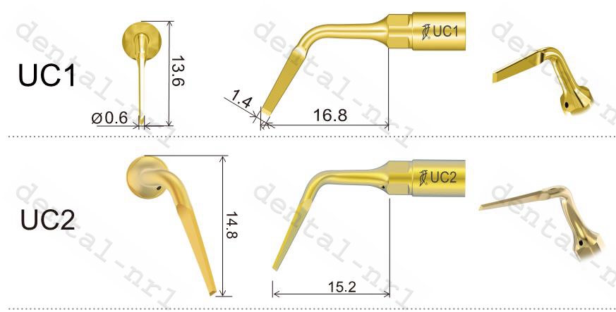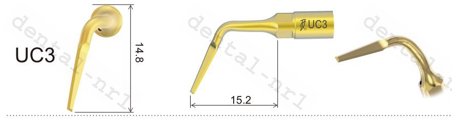 UC2: Links gekrümmt, verwendet, um die Ankylose abzuschneiden, Wurzelfraktionstechniken in den hinteren Regionen. UC3: Rechts gekrümmt, verwendet, um die Ankylose abzuschneiden, Wurzelfraktionstechniken in den hinteren Regionen.
