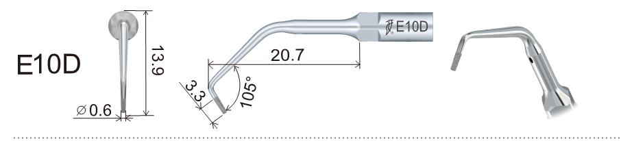 E10D Diamantbeschichtetes (40 μm) Instrument für die hocheffiziente Wurzelplanung bei der retrograden Aufbereitung von Wurzelkanälen. Die Länge der diamantbeschichteten Spitze beträgt (3,3 mm).