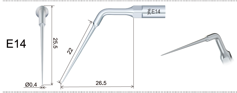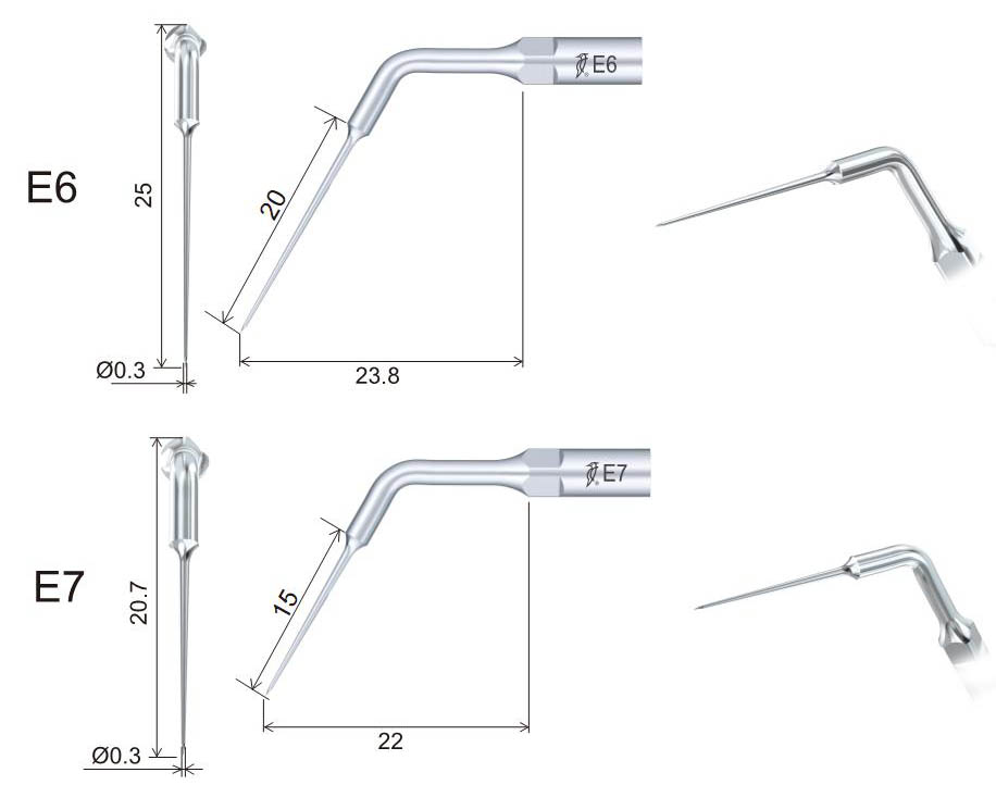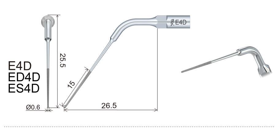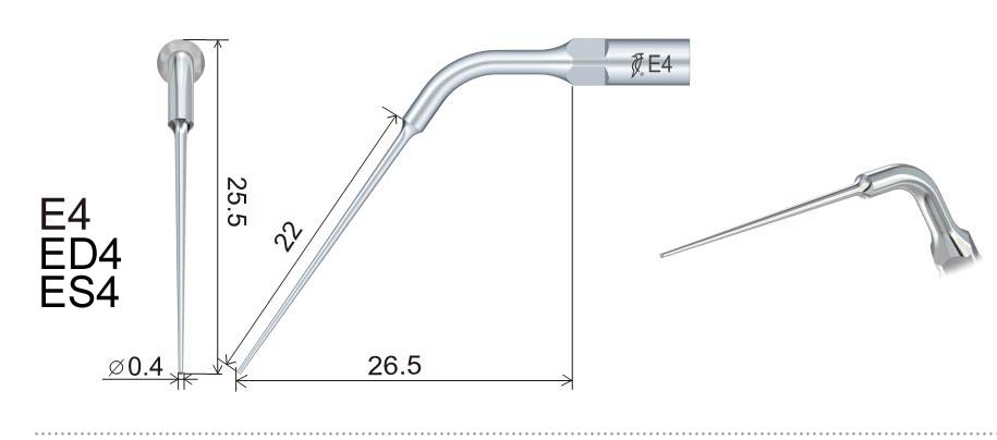 E4 Wird verwendet, um die Wurzelfüllungsverstopfungen während der Wurzelkanalrevision zu entfernen. Die Länge des schmalen Teils der Spitze beträgt (22 mm)
