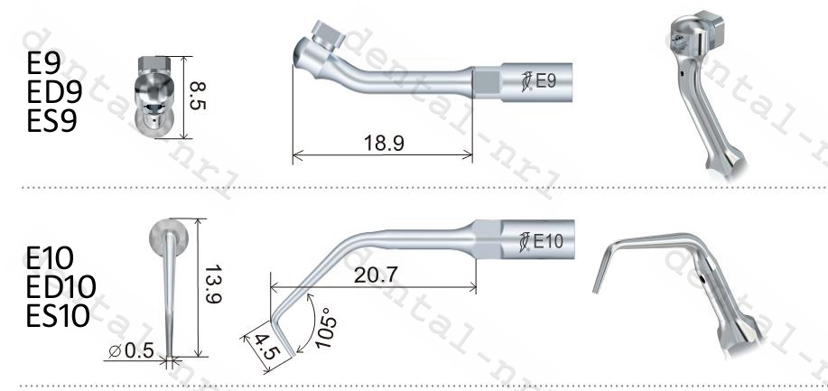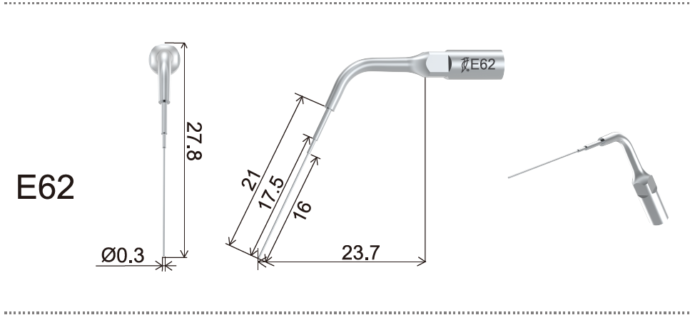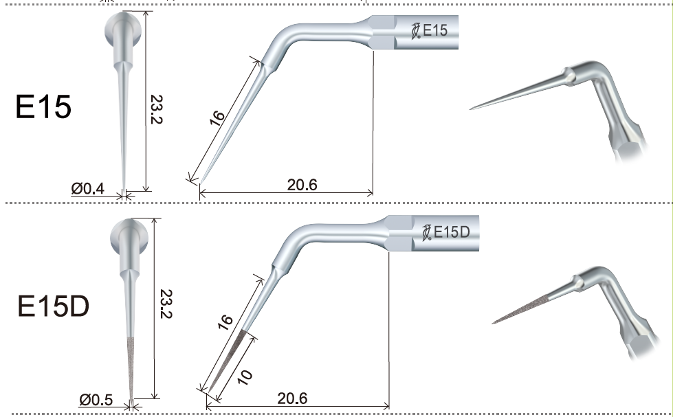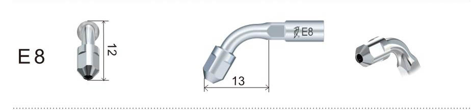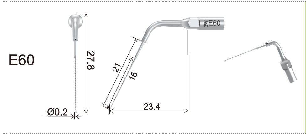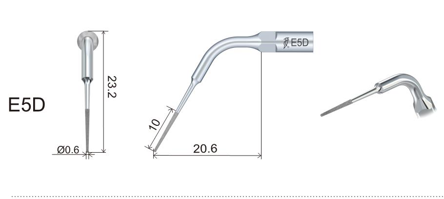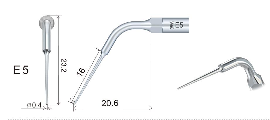 E5 Wird verwendet, um die Wurzelfüllungsverstopfungen während der Wurzelkanalrevision zu entfernen. Die Länge des schmalen Teils der Spitze beträgt (16 mm)
