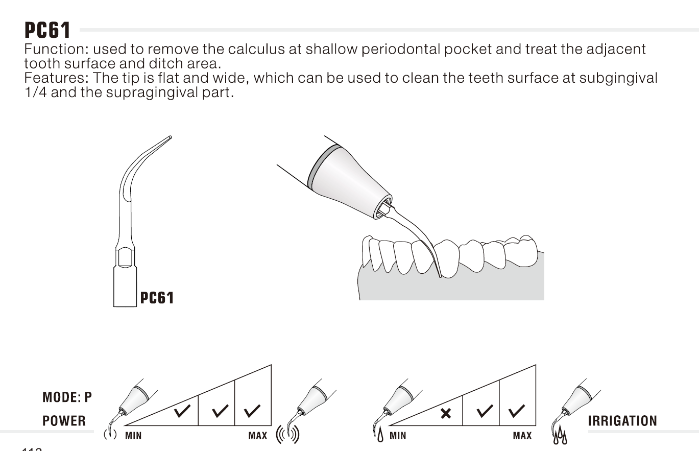 PC61: Funktion: Wird verwendet, um den Zahnstein an der flachen Parodontaltasche zu entfernen und die angrenzende Zahnoberfläche und den Grabenbereich zu behandeln. Merkmale: Die Spitze ist flach und breit, wodurch die Zahnoberfläche am subgingivalen 1/4 und am supragingivalen Teil gereinigt werden kann.