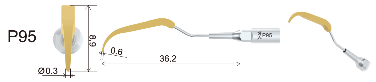 P95: Funktion: Reinigung und Wartung des Implantats. Größe: Der Kunststoffkopf ist 19 mm lang. Merkmale: Die Spitze hat eine schlanke Hakenform, was die subgingivale Reinigung und Wartung erleichtert. Verwenden: ein. Wird im P-Modus des Parodontalbehandlungsgeräts verwendet. Empfohlene Leistungsstufe: Stufe 1 ~ 6. b. Wird im P-Modus von U600 verwendet. Empfohlene Leistungsstufe: Stufe 1 ~ 3. c. Wird im P-Modus von U6 verwendet. Empfohlene Leistungsstufe: Stufe 1 ~ 6. Hinweis: (1) Das Kunststoffteil besteht aus PEEK-Material, das unter hoher Temperatur und hohem Druck infiziert werden kann. Je höher die Leistung, desto leichter ist es zu tragen. (2) Vermeiden Sie, dass die Spitze während der Operation im Zahnspalt steckt, um ein Brechen der Spitze zu vermeiden.